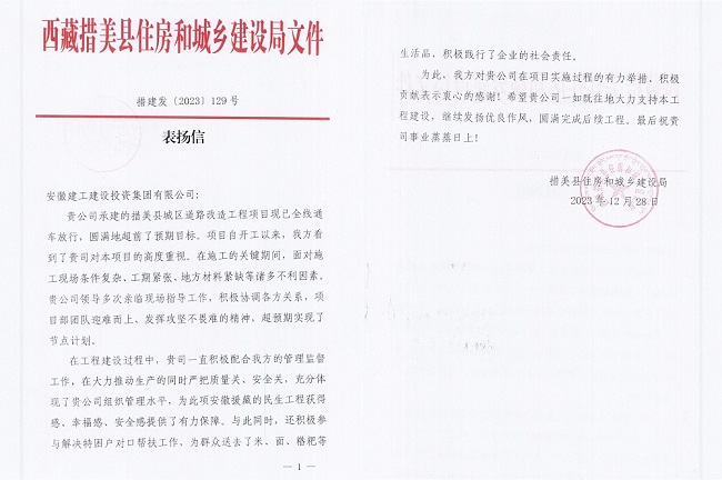 信中指出,措美县城区道路改造工程项目自开工以来项目团队迎难而上、发挥攻坚不畏难的精神,超预期实现了目标任务,同时积极参与措美县解决困难户对口帮扶工作。充分展现了诚信履约、顾全大局的国企风范,共同续写了新时代“皖藏一家亲”的深厚情谊。