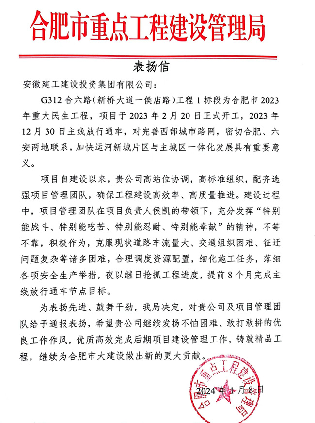 1月8日,建工建投集团收到合肥市重点局来信表扬。信中对建工建投集团及G312合六路(新桥大道-侯店路)项目管理团队提前8个月完成主线放行通车节点目标予以充分肯定和表扬。