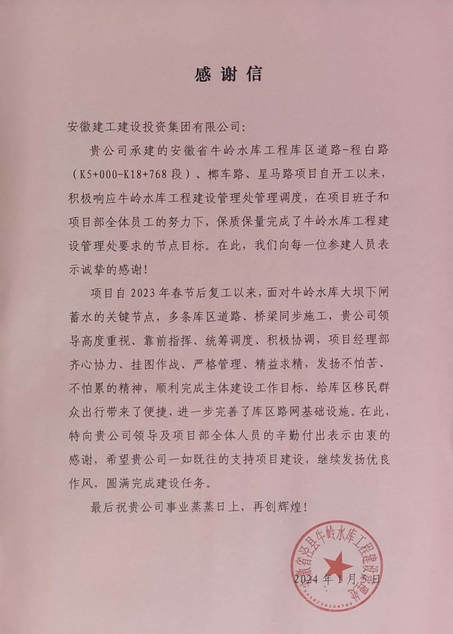 1月8日,建工建投集团牛岭水库项目收到安徽省泾县牛岭水库建设管理处来信感谢。信中对公司及牛岭水库项目管理团队保质保量完成各工程施工节点目标给予高度评价与充分肯定。