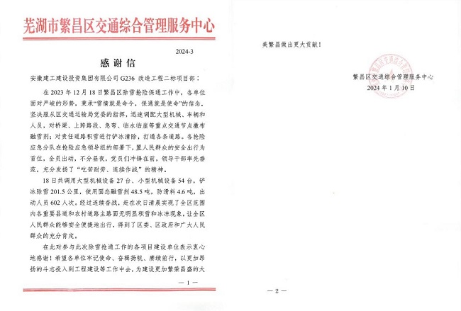 1月11日,繁昌区G236改造工程项目部收到繁昌区交通综合管理服务中心送来的感谢信,信中对繁昌区G236改造工程项目部在强降雪天气中,高效的除雪抢通工作表达了充分肯定,并致以衷心的感谢。