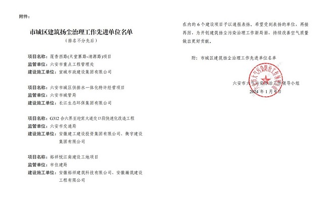 1月12日,G312合六界至迎宾大道交口段快速化改造工程项目部收到六安市大气污染防治工作领导小组的通报表扬文件。因G312合六界至迎宾大道交口段快速化改造工程项目在深入打好六安市蓝天保卫战深度治理各类建筑扬尘工作中做出了显著成绩,喜获通报表扬。