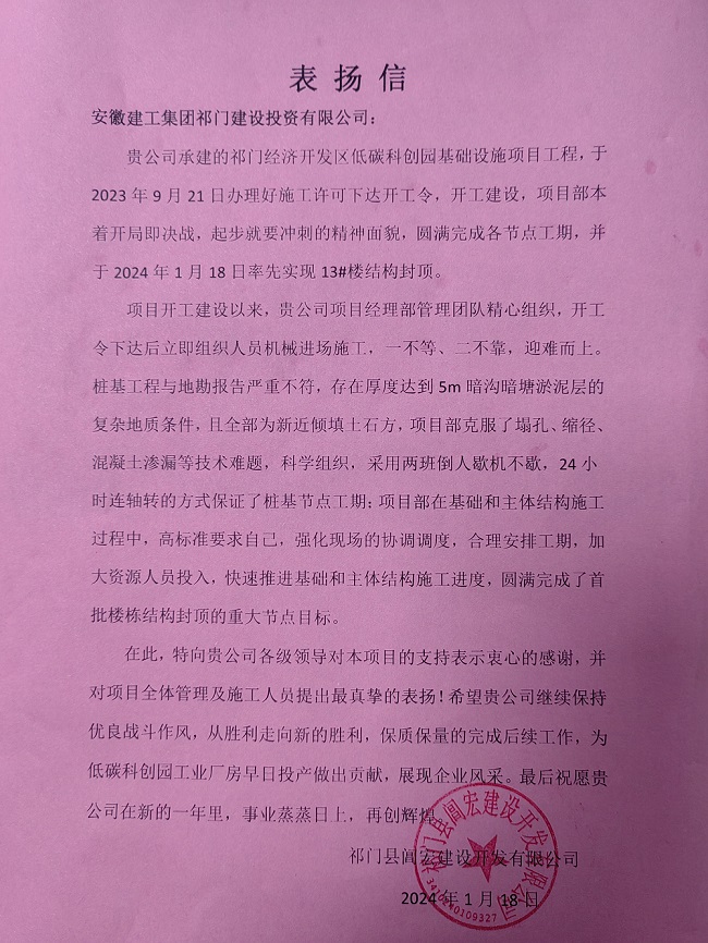 1月18日上午8时58分,祁门经济开发区低碳科创园基础设施项目一期EPC+O项目工程13#厂房主体结构率先完成封顶。项目部本着开局即决战,起步即冲刺的精神面貌和激流勇进、迎难而上的创业精神,圆满完成各项施工节点,受到了各级单位与业主的一致好评。