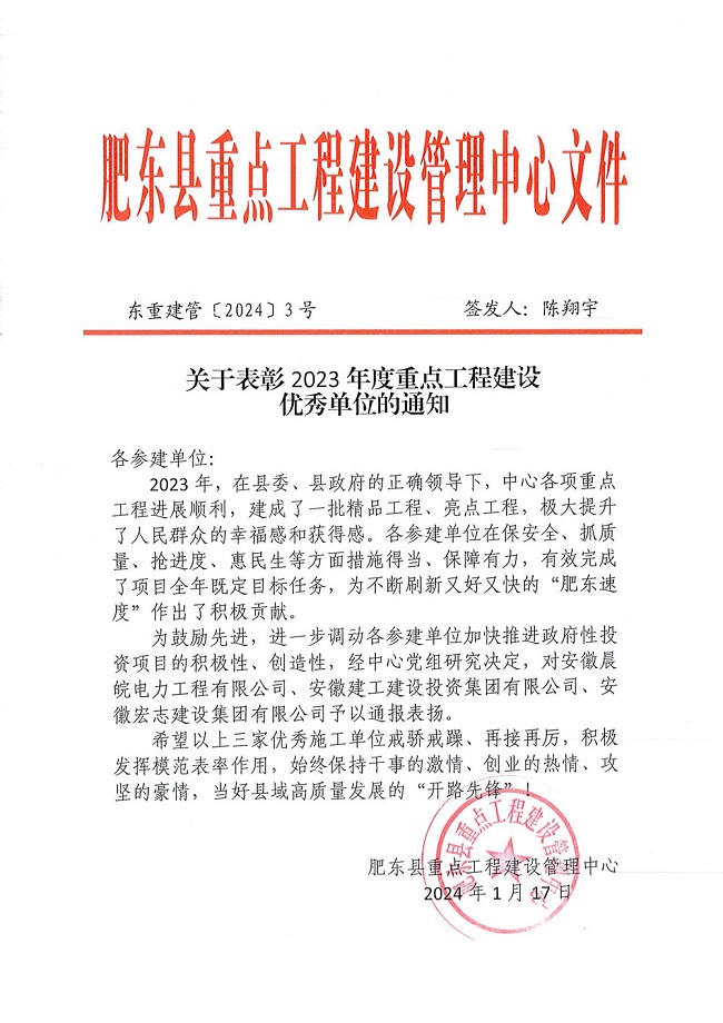 近日,建工建投集团收到肥东县重点工程建设管理中心发来的表扬信。信中对建工建投集团及白马山路等三条道路项目管理团队予以充分肯定和表扬。