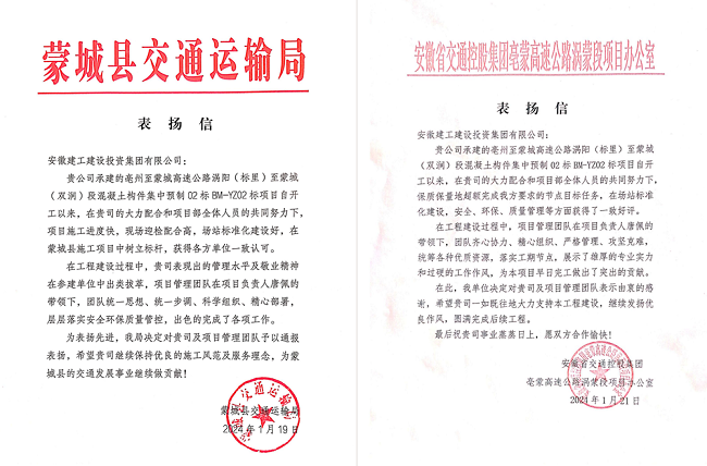 近日,建工建投集团亳州至蒙城高速公路涡阳(标里)至蒙城(双涧)段混凝土构件集中预制工程BM-YZ02标项目收到业主安徽省交通控股集团亳蒙高速公路涡蒙段项目办及主管单位蒙城县交通局发来的表扬信,信中对项目安全、环保、质量管理等方面予以肯定和表扬。