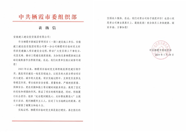1月28日,建工建投集团收到中共栖霞市委组织部发来的表扬信,对所属一分公司栖霞项目临时党支部抓党建融入项目建设全过程,带动广大党员职工干事创业、攻坚克难,推动工程建设高质高效,为加快完善栖霞新城区基础设施配套作出积极贡献给予表扬并向建工建投集团致以诚挚感谢。