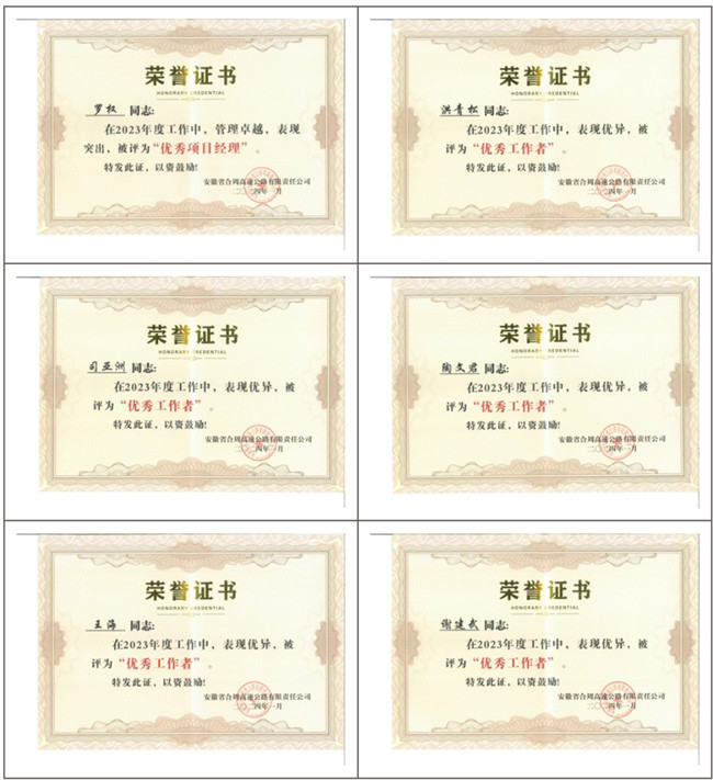 2月1日,安徽省合周高速公路有限责任公司发来《关于合周高速颍临段项目 2023 年度优秀单位及优秀个人表彰的通报》,合周高速颍临段YL-LJ02标项目经理罗权同志荣获2023年度“优秀项目经理”称号,司亚洲、王海、谢建武、洪青松、陶文君五位同志荣获2023年度“优秀工作者”称号。