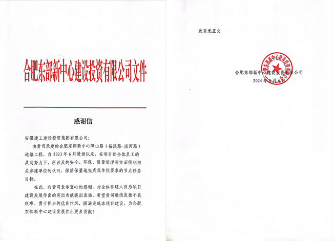 2月6日,合肥东部新中心障山路项目收到合肥东部新中心建设投资有限公司发来的感谢信,信中对项目管理团队的工作予以充分肯定和表扬,对建工建投集团的大力支持表示诚挚的感谢。