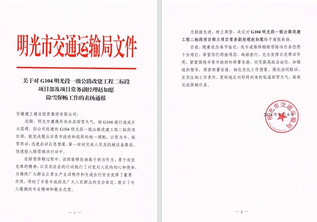2月6日,G104明光段一级公路改建工程二标段项目部收到明光市交通运输局发来的表扬信,信中对项目部在这次除雪保畅的工作予以充分肯定和表扬。