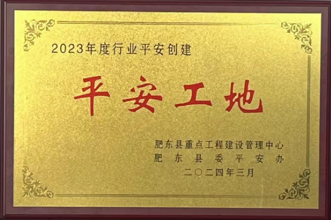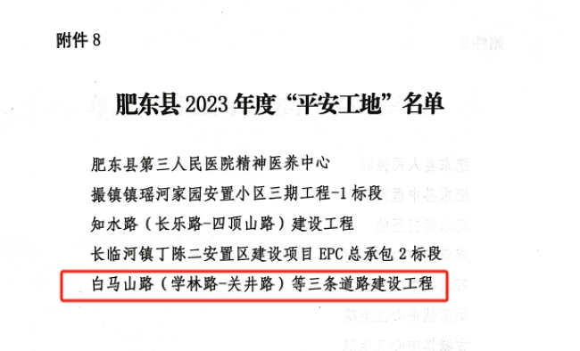 近日,建工建投集团承建的白马山路(学林路-关井路)等三条道路建设工程项目荣获肥东县2023年度“平安工地”称号,项目安全管理得到属地政府高度认可。
