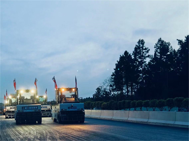 为确保无人摊压沥青下面层试验段顺利完成,项目部密切协调、机械设备、物资材料等关键生产要素,多次召开施工部署会。在混合料的拌合、运输、无人摊铺、无人碾压、检测等各个关键工序上,多次进行交底、培训、分工,责任到人,保证试验段在质量及安全上得到可靠保证。在项目全体人员的共同努力下,试验段在17点38分开始摊铺,历经3小时40分钟,于21点18分碾压结束,共施工710吨混合料,现场采用无人摊铺机一台,13吨无人双钢轮压路机3台,30吨无人胶轮压路机4台,运输车11辆。