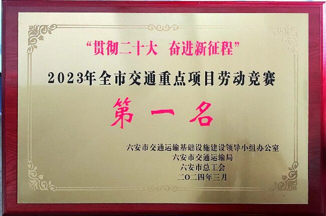 在六安市交通基础设施建设领导小组办公室、市交通运输局、市总工会公布的“贯彻党的二十大 奋进新征程”—2023年六安市交通重点项目劳动竞赛活动综合考评结果中,建工建投集团承建的G312合六界至迎宾大道交口段快速化改造工程荣获2023年全市交通重点项目劳动竞赛第一名,被评为“优秀施工单位”。
