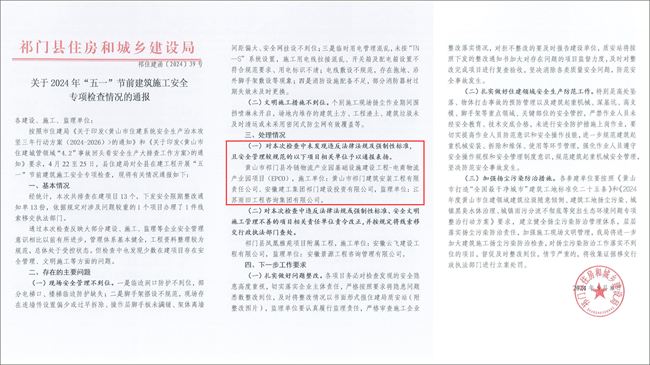 近日,祁门县住建局发布《关于2024年“五一”节前建筑施工安全专项检查情况的通报》,对祁门电商物流产业园项目予以通报表扬。