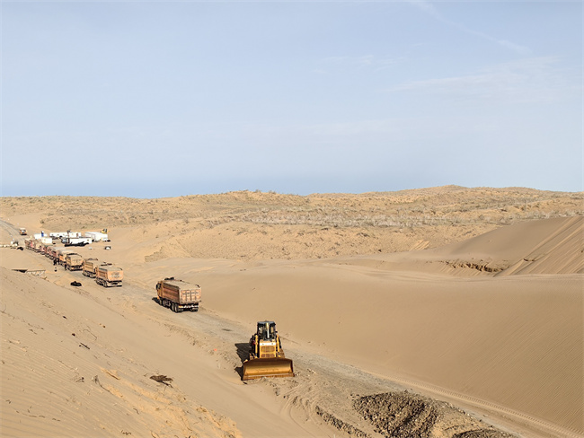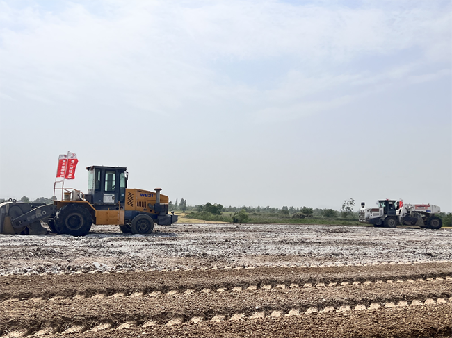 新疆光伏产业园项目K37+700-K39+200段路基戈壁料施工现场,苍茫大漠中几十辆工程车辆来回穿梭,一片紧张忙碌。截止目前,路基填筑共计完成38公里,累计完成率为60%,各施工环节有序推进。