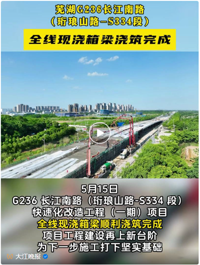 5月15日,正在施工的G236 长江南路(珩琅山路-S334段)快速化改造工程(一期)项目传来好消息,全线现浇箱梁顺利浇筑完成,项目工程建设再上新台阶,为下一步施工打下坚实基础。