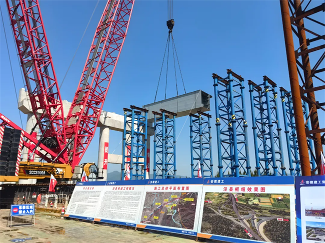 泾青一分部项目确保工程质量和进度同步优化,有序推进工程建设。在钢箱梁架和枢纽E匝道桥9#墩下系梁浇筑施工现场,现场管理人员严守安全红线,把握施工技术要点,全程盯控现场,确保施工进度与质量的双重保障。