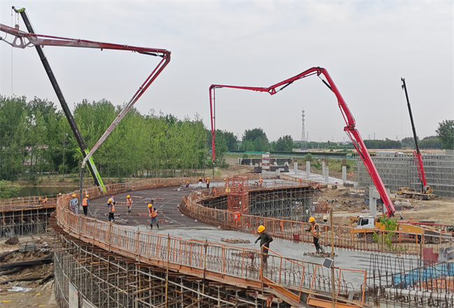 五蒙高速05标项目现场,匝道桥涉水现浇梁施工正如火如荼地进行,现已全部完成枢纽下部结构施工阶段,正式进入主线桥面系施工阶段。现场时间仿佛被按下了快进键,机器轰鸣声此起彼伏,各类工程车辆往来穿梭,工人们挥汗如雨,分工明确,在各自的岗位上紧张而有序地忙碌着,大家都在以只争朝夕的劲头和分秒必争的行动,齐心协力、全力以赴推进工程进度。