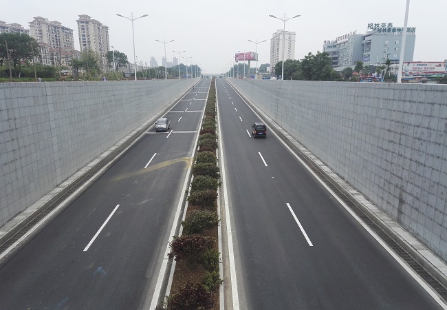 道路等级:本项目采用一级公路兼顾城市道路功能标准,路基宽44米,沥青混凝土路面;隧道段采用分离式双向四车道,设计速度60km/h,建筑限界净宽2×10米,净高5米,设计荷载等级为公路-I级;解放南路(G312-南屏路)衔接改造解放南路宽60米,机动车道为双向八车道,两侧各设置5.5米宽非机动车道。