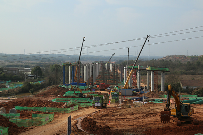 2月21日上午,在宣泾高速公路一期节点性工程——宣城枢纽施工现场,运输车辆往返穿梭,大型吊机轰鸣起吊,挖土机挥臂挖土平坑,工人们在各自的岗位上忙碌着,一片紧张有序的繁忙景象。