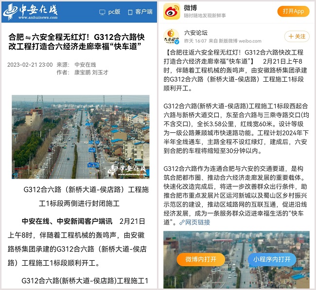 如今,随着G312合六界至迎宾大道段快速化改造工程即将全面竣工,合肥开车往返六安实现了有一条高速、两条一级公路标准的国省干线连接的目标。 据了解,随着G312合六界至迎宾大道段快速化改造工程主线贯通,合六路肥西段快速化改造工程也在紧锣密鼓地进行中。 中安在线、六安论坛:G312合六路(新桥大道-侯店路)工程 2月22日,中安在线以《合肥往返六安全程无红灯!G312合六路快改工程打造合六经济走廊幸福“快车道》为题,报道路桥集团举行开工仪式,介绍项目工程意义。 以下为报道原文: 2月21日上午8时,伴随着工程机械的轰鸣声,由安徽路桥集团承建的G312合六路(新桥大道-侯店路)工程施工1标段顺利开工。 G312合六路(新桥大道-侯店路)工程施工1标段西起合六路与新桥大道交口,东至合六路与三乘寺路交口(均不含交口),全长3.58公里,红线宽60米。设计等级为一级公路兼顾城市快速路功能。工程计划2024年下半年全线通车,主路全程不设红绿灯,建成后,六安到合肥的车程将缩短至30分钟以内。 G312合六路作为连通合肥与六安的交通要道,是构筑合肥都市圈、推动合六经济走廊发展的重要载体。快速化改造完成后,将进一步改善群众出行条件,助推合肥市重点发展片区运河新城以及蜀山区乡村振兴示范区的建设,推动区域路网的互联互通,促进沿线经济发展,成为一条服务群众迈进幸福生活的“快车道”。 战鼓已擂,号角已响,目标所向,使命必达。接下来,安徽路桥集团G312合六路(新桥大道—侯店路)工程项目全体员工将以高度的责任感和使命感,精心组织协调,强化责任落实,严控工程质量,全力推进工程进度,确保G312合六路项目顺利完工。 中安在线:G312合六路(南岗镇-侯店路)工程 2月23日,中安在线以《【奋进的春天】跑出“加速度”!合肥重大项目建设如火如荼》为题,图片新闻形式报道G312合六路(南岗镇-侯店路)项目全力以赴推进项目建设。 以下为报道原文: 2月22日,在安徽路桥集团承建的长江西路与方兴大道互通立交桥项目工地,打桩机、吊车、挖机等百余台大型机械轰鸣作业,500余名工人正在工地各个点上有序忙碌,抓好春季黄金施工期,全体以赴推进项目建设。 据悉,合肥市长江西路与方兴大道互通立交桥是G312合六路快改的重要节点工程,作为连通合肥与六安的交通要道,该标段(南岗镇-侯店路)工程全长2.45公里,其中主线高架桥梁起点位于火龙地路以西,向东依次上跨火龙地路、方兴大道后落地,工程范围包含合六路主线高架桥梁(左、右分幅设置)及8条匝道桥梁。 该项目负责人张军介绍,工程计划今年5月份实现主线桥通车目标。春节复工以来,项目部制定节点施工计划,合理调度施工机械,妥善安排各队伍施工人员,高标准、高效率、高质量推动重点项目早日完工。