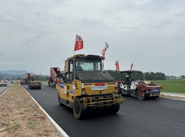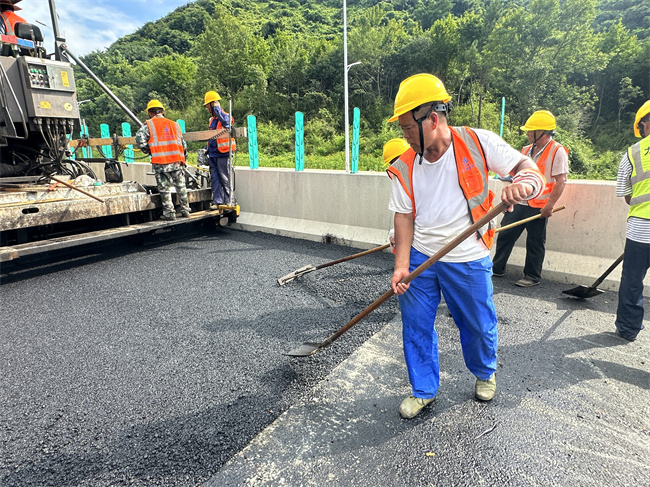 建工建投集团繁昌S334项目施工现场,36度高温的“烤”验没有阻挡任何一位施工人员热火朝天的干劲,工人们站在滚烫的沥青料上,头顶烈日、挥汗如雨,全身心地投入到沥青中面层摊铺施工中,为实现最终通车目标发起冲刺。