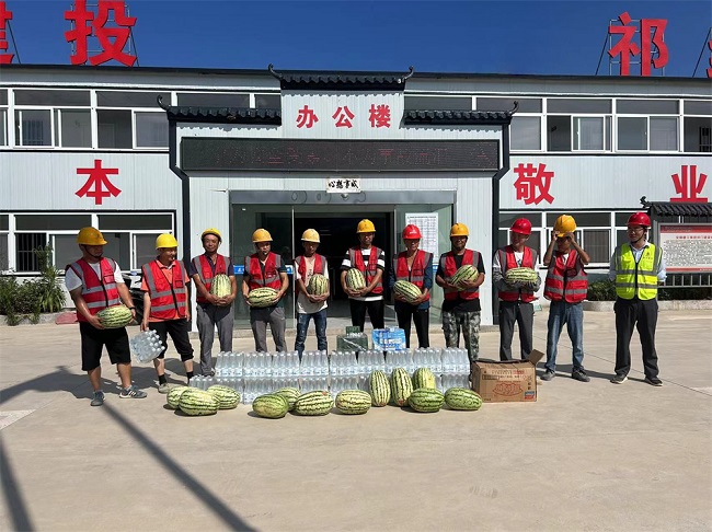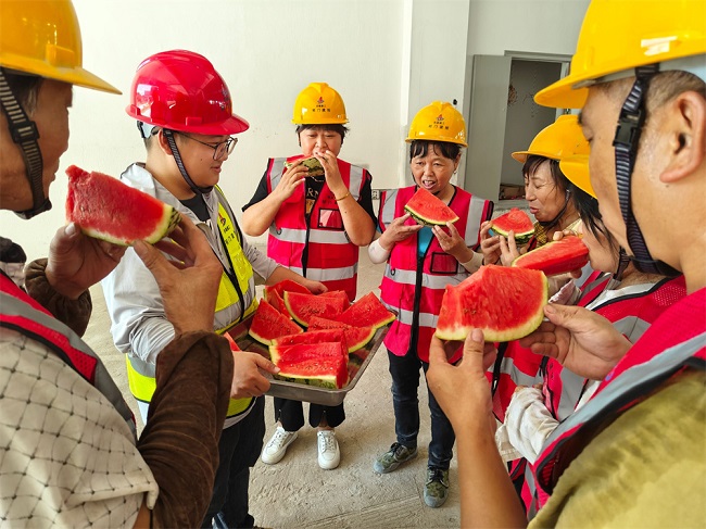 为了确保建筑工人的身体健康和施工安全,项目部高度重视防暑降温工作,提前制定了详细的防暑降温方案。项目部实行“抓两头、歇中间”的作息制度,让工人们能够在相对凉爽的时间段进行作业。在施工现场,项目部设置了多个防暑降温休息点,配备了充足的饮用水、绿豆汤、西瓜、藿香正气水等消暑“神器”,保障一线建设者度过高温天气。