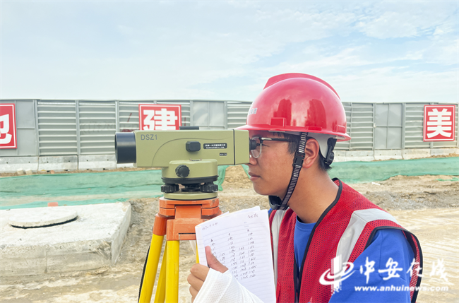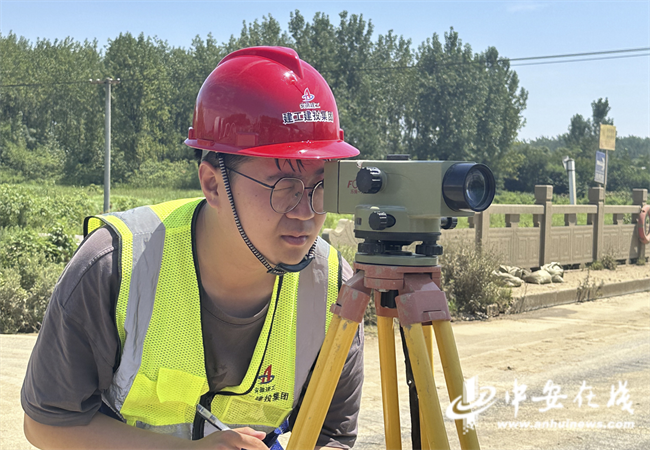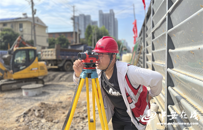 在烈日炙烤和酷暑考验下,合肥市杨岗路、幸三路等 2 条道路项目现场技术人员冒着酷暑,使用水准仪精确测量和复核管道开挖的高程,确保施工质量与安全。施工现场严格实施错峰施工与全面防暑降温各项举措,保障施工人员健康安全,确保各项目施工有序安全平稳推进。