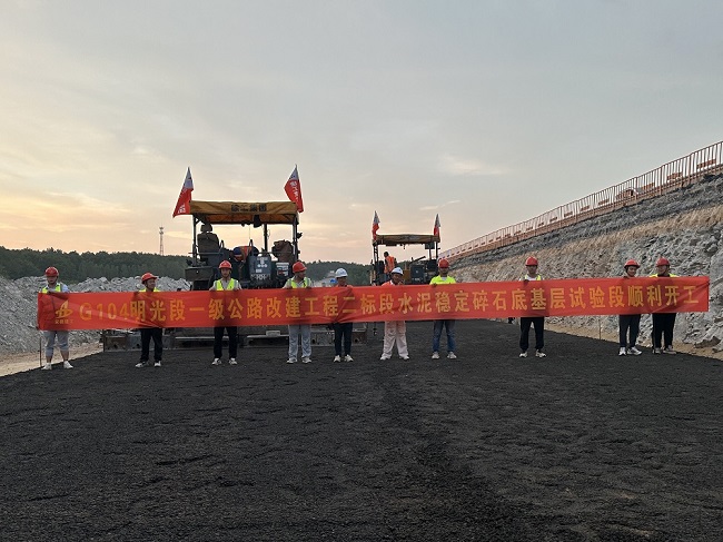 9月10日,G104明光段一级公路改建工程二标段底基层水稳试验段顺利完成铺筑,标志着进入路面施工阶段。