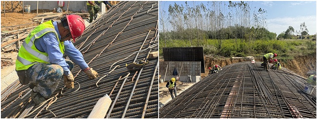钢筋是建筑的骨架、脊梁,起到支撑作用,就像人的骨骼一样,绑扎过程中不能有丝毫马虎。现场工人和技术人员头戴安全帽,身穿反光背心,加班加点,巧手扎起“钢筋铁骨”,为拱圈浇筑做好充分准备,保证建筑骨架安全支起,全力以赴加快施工进度,高质高效快速推进项目建设。