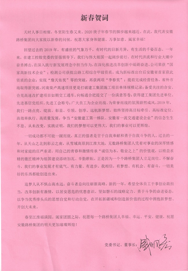 天时人事日相催,冬至阳生春又来。2020庚子年春节的脚步越来越近。在此,我代表安徽路桥集团向大家致以新春的问候,祝愿大家身体健康、万事如意、阖家幸福!