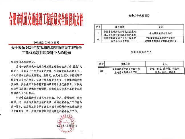 近日,合肥市轨道交通建设工程质量安全监督站发来《关于表扬2024年度我市轨道交通建设工程安全工作优秀项目和先进个人的通知》,建工建投集团合肥市轨道交通7号线一期土建施工总承包2工区项目荣获“安全工作优秀项目”称号,邓炜、傅斌华荣获“安全工作先进个人”称号。