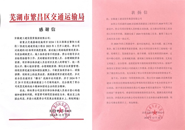 近日,由建工建投集团承建的S334(长江南路至繁阳大道段)快速化通道改造工程02标项目、S345泾县榔苏路项目先后荣获业主来信表扬,对所属项目圆满完成2024年度各项建设任务,项目管理人员积极主动协调,及时增派项目管理人员、合理调配劳务资源,全力推动项目建设表示充分肯定,对公司及项目部全体参建人员表示衷心的感谢。