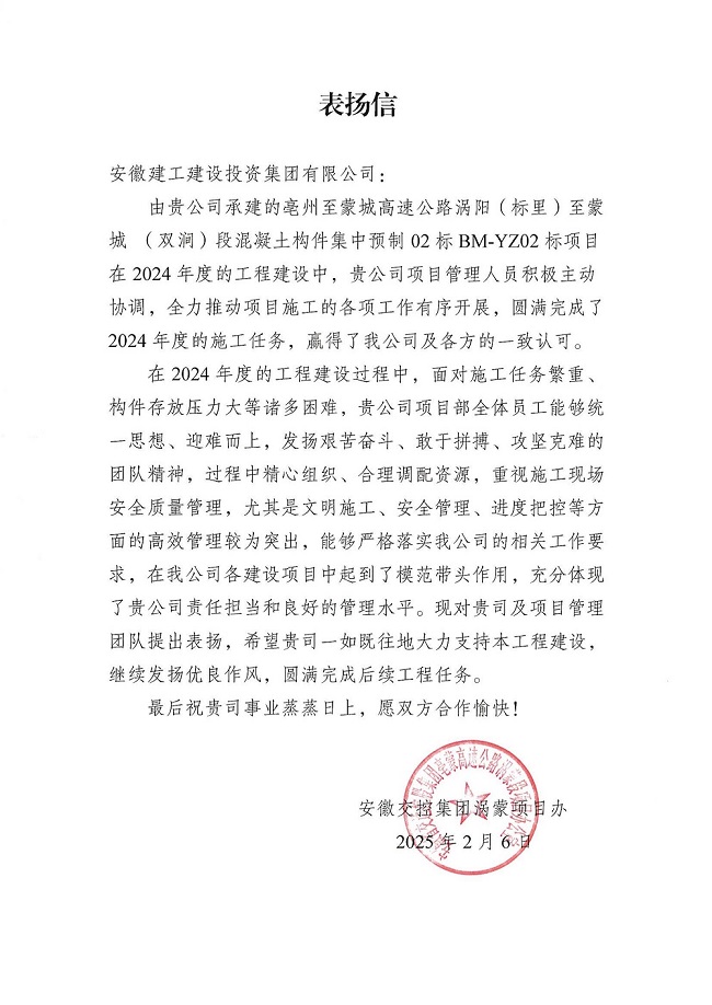 表扬信指出,亳蒙预制02标项目在2024年度的工程建设过程中,面对施工任务繁重、构件存放压力大等诸多困难,项目部全体员工能够统一思想、迎难而上,发扬艰苦奋斗、敢于拼搏、攻坚克难的团队精神,过程中精心组织、合理调配资源,重视施工现场安全质量管理,尤其是文明施工、安全管理、进度把控等方面的高效管理较为突出,能够严格落实业主单位的相关工作要求,在各建设项目中起到了模范带头作用,项目管理人员积极主动协调,全力推动项目施工的各项工作有序开展,圆满完成了2024年度的施工任务,赢得了业主单位及各方的一致认可。