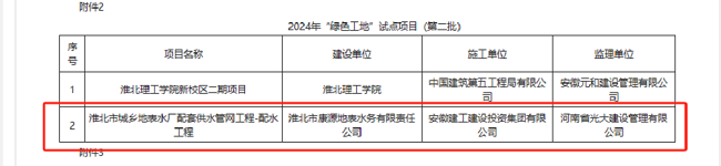 近日,我司承建的淮北市城乡地表水厂配套供水管网工程-配水工程再次传来喜讯,项目部在2024年淮北市第二批“四个工地”试点的评选中成功被授予“绿色工地”试点称号!这是在该项目被成功授予“安心工地”试点称号后所取得的又一项殊荣,更是对我司在绿色施工、节能环保方面取得成绩的高度认可,也是践行国家“碳达峰、碳中和”战略目标的具体体现。