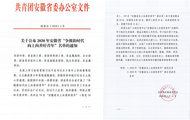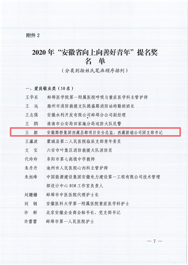 近日,安徽路桥集团西藏昌都项目安全总监、西藏新瑞公司团支部书记王颖获得2020年“安徽省向善向上好青年”提名奖。