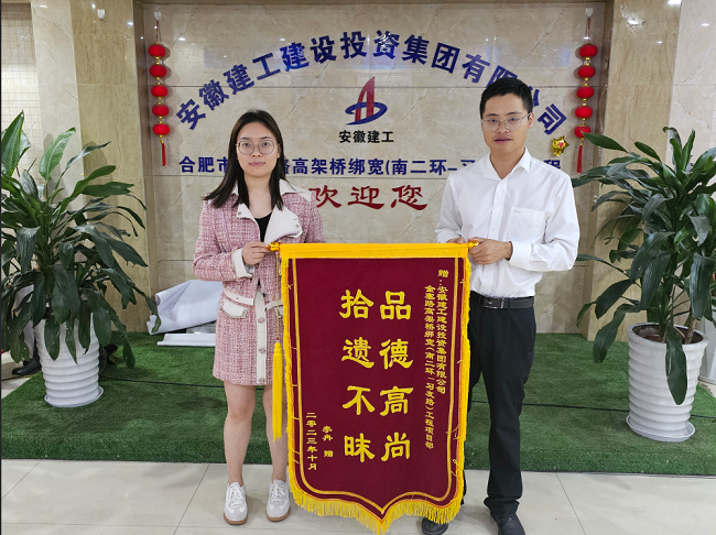 10月16日上午,金寨路高架桥绑宽项目管理人员在桥上巡查时发现一包衣物,查看后发现衣物价值不菲,想到失主必定很焦急,于是将衣物妥善保管起来,并迅速在互联网平台发布信息寻找失主。10月17日下午,失主李女士通过警察联系上金寨路高架桥绑宽项目地方协调人员,核实无误后,项目部将遗失衣物交还李女士。李女士拿着失而复得的衣物欣喜万分,对拾金不昧的项目部员工表示了衷心的感谢,并送上了锦旗。