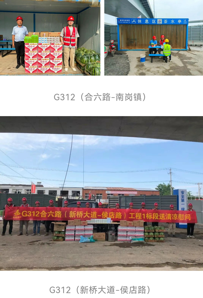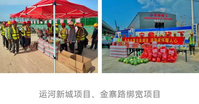 6月10日起,安建交建公司各项目分别组织安全部、综合部等工作人员为奋斗在一线岗位的作业人员送去防暑药品、西瓜、矿泉水、绿豆等防暑降温物品,并在施工现场设置休息区、茶水亭等,为施工人员提供休息和避暑的场所,为奋战在施工一线的员工送去关怀和问候。