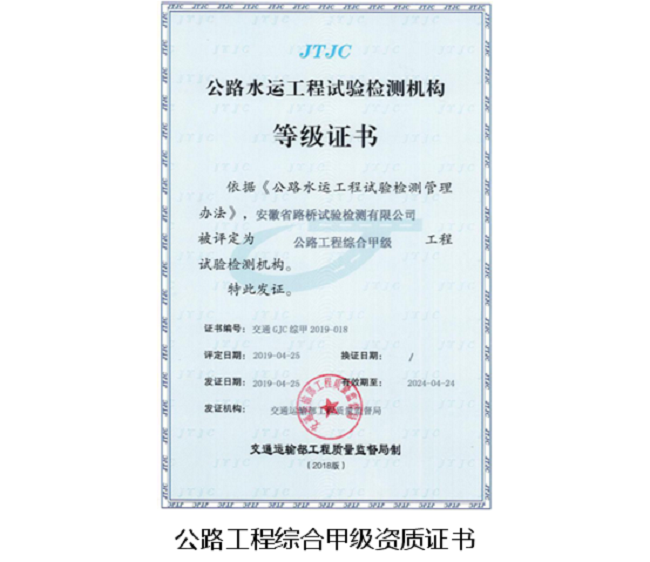 随着检测公司业务规模的不断扩大,原有的乙级资质已经成为制约检测公司发展的主要瓶颈。为适应未来检测行业的市场竞争形势和发展趋势,2017年,在安徽建工集团和安徽路桥集团的大力支持下,检测公司正式启动资质升甲工作,因时而“升”。为了实现综合甲级的梦想,检测公司全体员工众志成城、取消休假、加班加点。2018年10月,升甲资料正式上报,12月交通运输部专家莅临现场评审,2019年4月,检测公司顺利取得公路工程综合甲级资质。自此,检测公司实现弯道超车,进入到全面发展阶段。