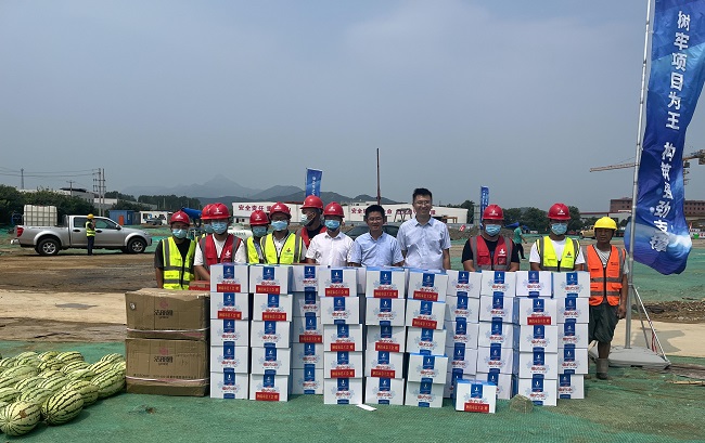 柳广东一行走进施工现场,实地查看了当前项目的建设情况,与一线职工和疫情防控值班人员进行亲切交流,感谢他们在高温时节坚守岗位,为保障项目建设付出的辛勤劳动,并送上防暑降温物品。