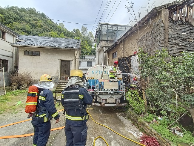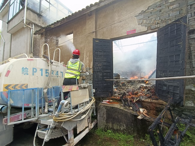 3月29日下午2点左右,黄千高速02标项目所在的武阳乡一制茶传统作坊突发火灾,现场浓烟滚滚,火势猛烈。项目部现场施工人员察觉到火情后,立刻拨打119报警并向项目部反馈。对此,项目部第一时间做出紧急部署,迅速安排由安全部牵头,组建应急救援小队,从施工现场调派洒水车第一时间奔赴现场参与灭火。
