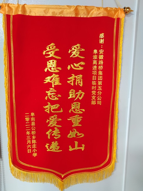 3月25日,阜南县公桥乡陈庄小学将一封感谢信和一面写有“爱心捐赠恩重如山 受恩难忘把爱传递”的锦旗送至第五分公司阜淮高速项目临时党支部,以表达对项目部爱心助学行为的感激之情。