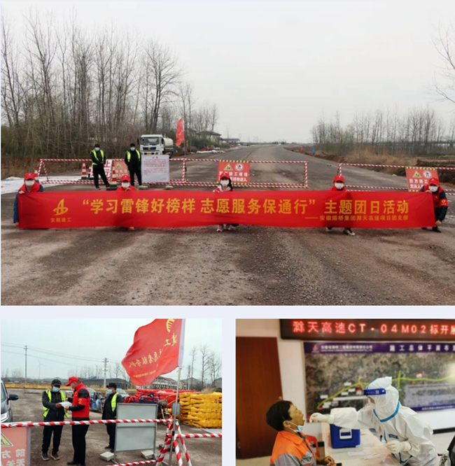 活动期间,滁天高速项目开展“学习雷锋好榜样,志愿服务保通行”主题团日活动。滁天高速项目团支部积极动员广大青年职工错峰轮岗,主动参与到当地交通管制道口值勤,承担起“人人都是安全员”的岗位责任,为项目安全生产、周边居民出行保驾护航。此外,项目部主动联系来安县医院对标段内400多名参建人员进行免费核酸检测,积极选派项目青年团员参与到G235(滁州市来安县与南京六合区)疫情防控卡点值班,协助属地政府做好往来人员核码、测温及车辆管控工作,并向现场工作人员送上慰问物资,为打赢疫情防控阻击战尽一份责任和义务。