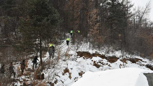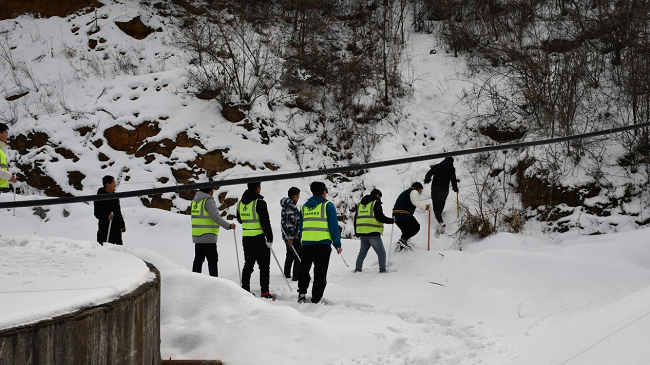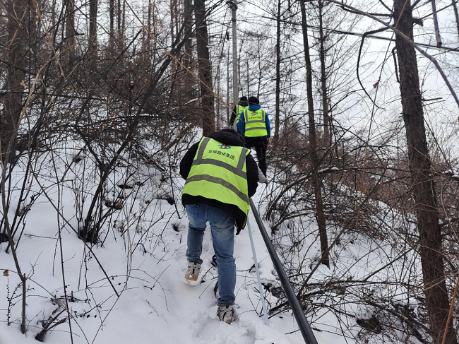 2022年2月10日至21日,在大雪纷飞的天气里,栾卢项目部先后数次组织人员,利用中午的时间穿梭在3座山林间,对沿线水管进行仔细排查。山林里没有路,大家相互搀扶沿着管道用小木棍将水管里的冰一节一节敲碎,保持管道里的水正常流动。同时,项目全员历时10余天,合力解决冻住的水管,更换烧坏的电机水泵等设备,顺利让项目部及周边地区用上自来水。