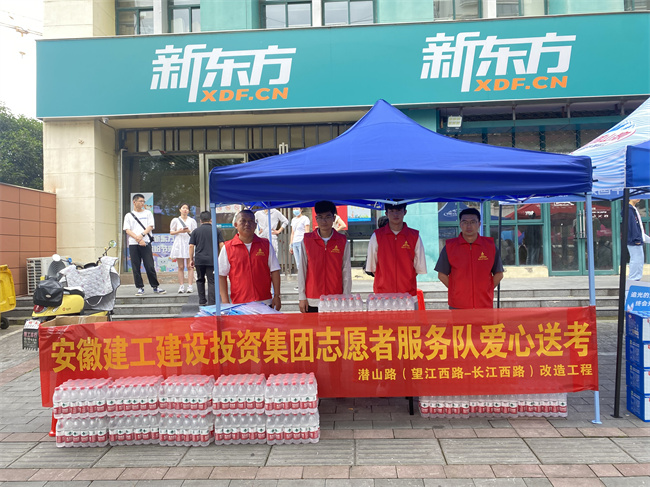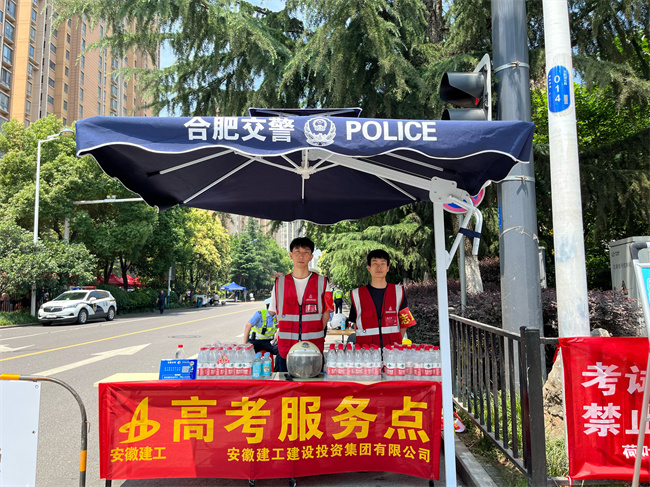 金寨路高架桥绑宽项目组织共青团员成立一支高考志愿服务队,在考点外设置“高考服务点”,向有需要的考生和家长免费发放考试必备文具、矿泉水、防晒帽及防暑降温等爱心物资,为考生送去一声声“加油”鼓劲声,为场外等候的家长提供休息凳、凉棚和祝福。