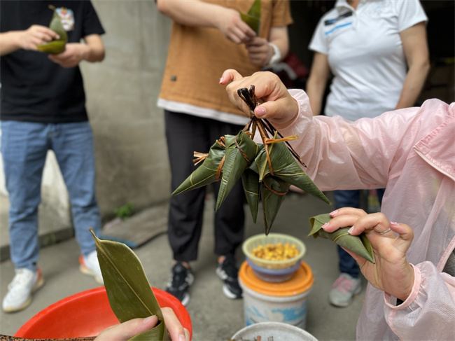 大家互相分享着包粽子的经验,将满载美好寓意的莲子、蜜枣、红豆、绿豆、花生、用清香箬叶包裹,欢声笑语中,一片片粽叶、一粒粒糯米,在灵巧的手中变成了香甜可口的粽子。