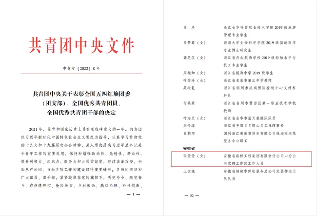 2022年是中国共青团成立100周年。近日,共青团中央作出表彰决定,安徽路桥集团一分公司党群工作部张莹莹荣获“全国优秀共青团员”称号,该称号是共青团中央授予团员青年的最高荣誉!