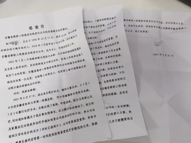 “病魔无情,集体有爱,公司领导的重视关怀和同事们的爱心力量,使我重获新生……我因我是安徽路桥集团的一员而骄傲”这充满力量与感激的话语,来自公司设计总院职工送来的一封感谢信。