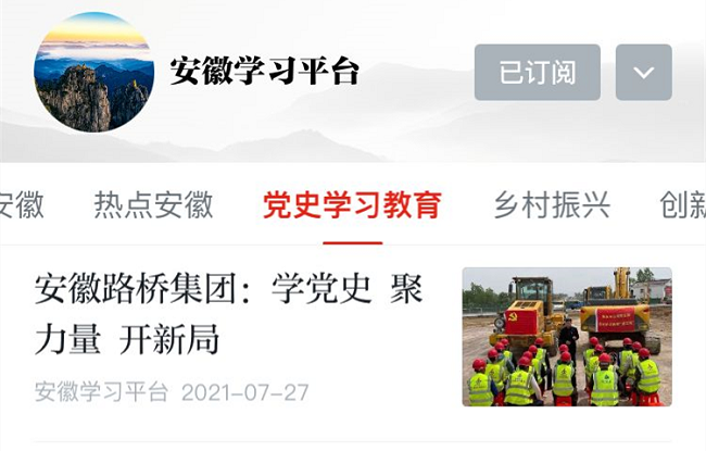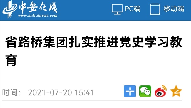 近日,“学习强国”安徽学习平台和“中安在线”分别以《安徽路桥集团:学党史 聚力量 开新局》、《省路桥集团扎实推进党史学习教育》为题,对公司党史学习教育工作开展情况进行详细报道。