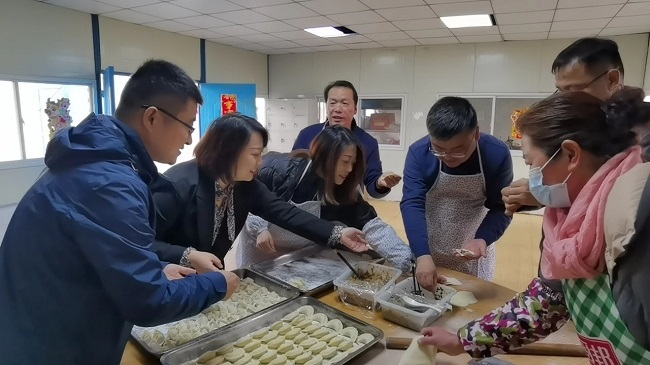 看见厨房正忙活着擀饺皮、拌饺馅,王书记也加入到包饺子的行列,把对员工和公司的美好祝愿包进了每一只饺子里。希望他们在新的一年,继续保持不畏艰难、锐意进取的奋斗韧劲,以不怕苦、能吃苦的牛劲牛力,勇往直前!