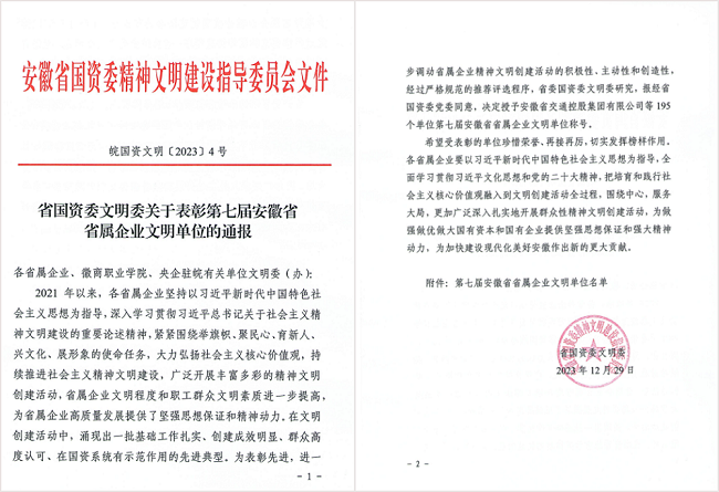 近日,省国资委文明委印发《关于表彰第七届安徽省省属企业文明单位的通报》,安徽建工建设投资集团有限公司被授予第七届“安徽省省属企业文明单位”称号,这是公司连续2届获此殊荣,标志着公司精神文明创建工作再结新硕果。