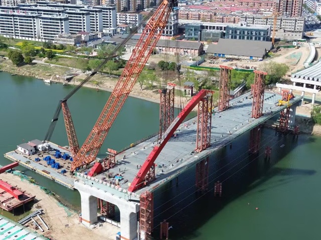 该桥为下承式钢箱系杆拱桥,主跨140米,上跨III级通航航道。此次吊装的首段拱肋长44.228米、宽1.548米、高1.548米、设计重量110.49吨,采用600吨浮吊自身稳定及精准定位,克服了航道繁忙、水流湍急等挑战。施工前,项目团队运用BIM技术模拟吊装路径,过程中,实时动态监测风速、水位与监控量测并行指导起吊、转体、移位、调姿、落梁与就位,顺利实现大节段、大仰角拱肋精准起吊与安装。